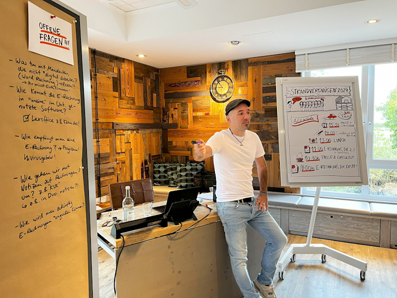 Am nächsten Tag ging es dann inhaltlich zur Sache. Der Vormittag stand ganz im Zeichen der Fortbildung zur E-Rechnung, die ab 2025 verpflichtend wird. Es waren zwei eine intensive, aber sehr lehrreiche Sessions, mit denen wir den Grundstein gelegt haben, um uns und unsere Mandanten auf die neuen Regeln vorzubereiten.